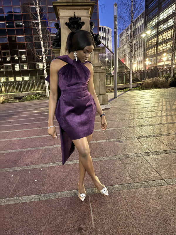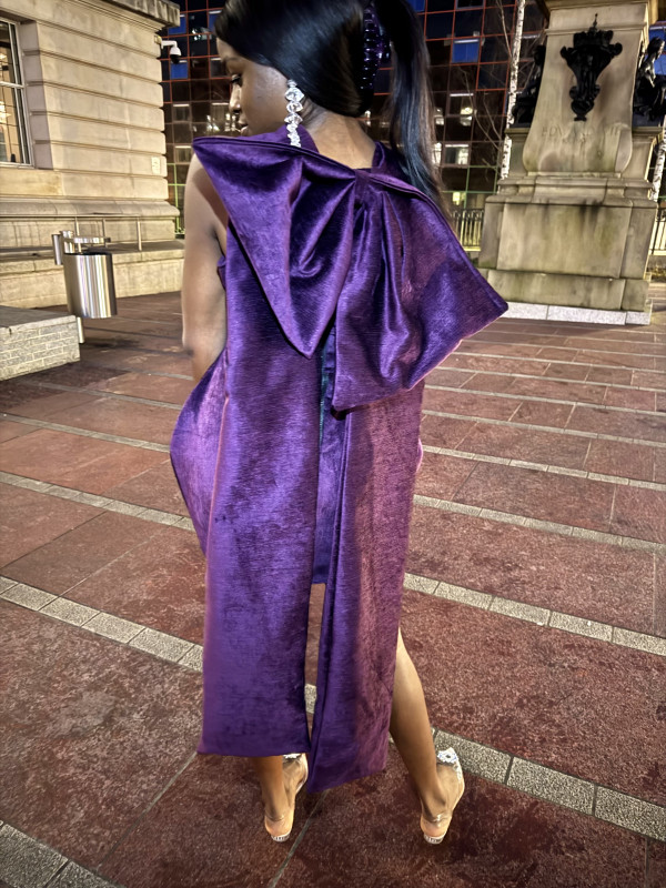 The silhouette walks the line between softness and precision — a twist, a curve, a sculpted intention that brings the piece to life. The halter detail creates a striking frame for the shoulders, while the back reveals an unexpected flourish: a bold bow that feels like the final stroke of a beautifully wrapped secret. It’s no decor, it’s attitude, captured in fabric.