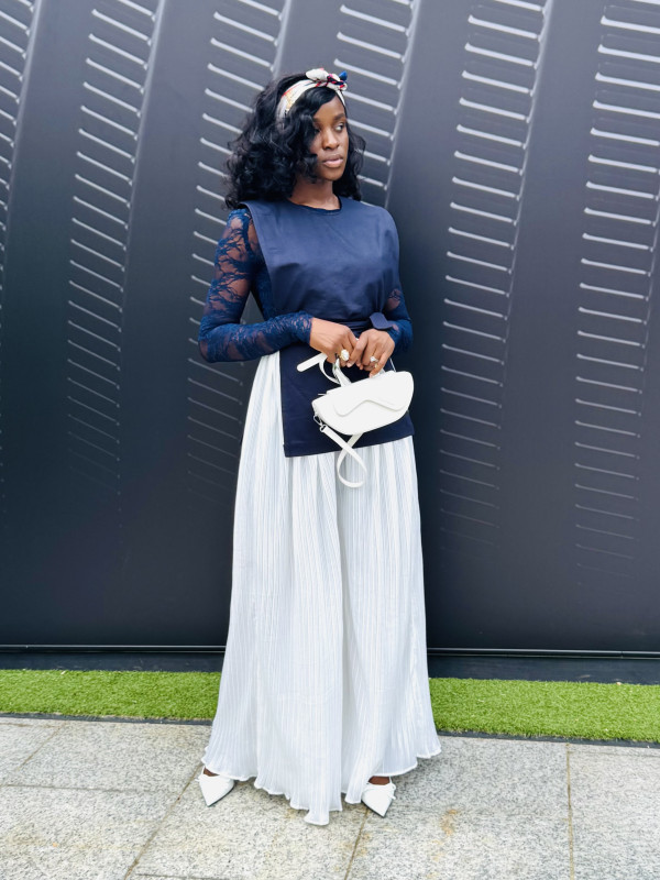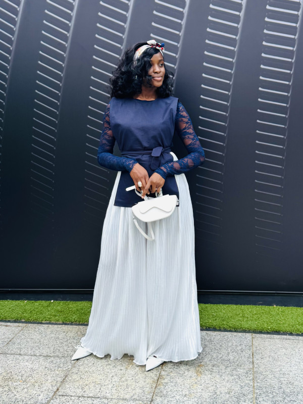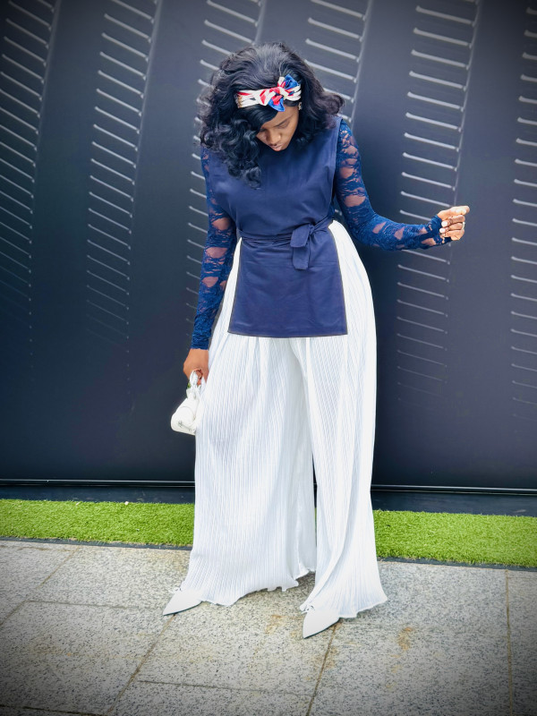 Power meets poetry in The Élan Ensemble. The silk accordion Palazzo glides with effortless fluidity, while the chantilly lace top subtly teases the eye with its intricate transparency. Over it all, the structured cotton twill cape adds a bold architectural flourish, its open panels and waist-cinching belt sculpting the silhouette with precision and flair.