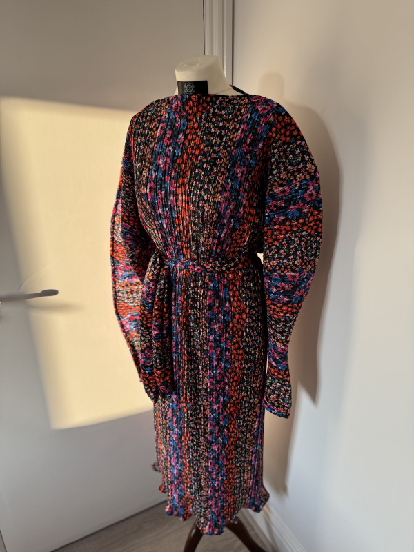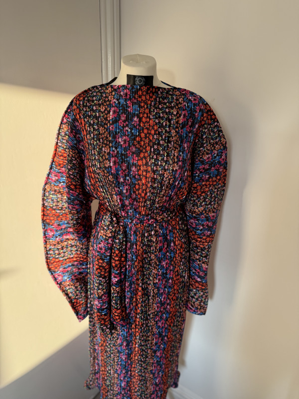 Its rich tapestry of bright, floral-inspired colors offers effortless pairing with accessories of any shade — making it a versatile go-to for formal events and statement moments alike. The high neck adds a touch of refined sophistication, while the minimalistic structure ensures that simple becomes the new extra.