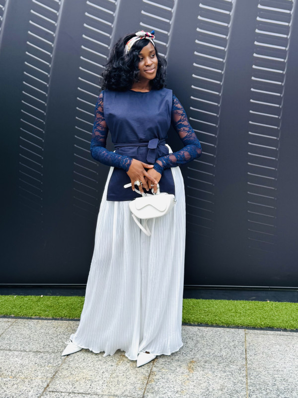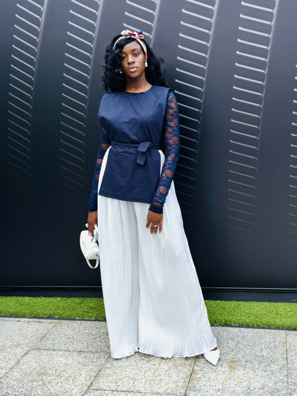 Power meets poetry in The Élan Ensemble. The silk accordion Palazzo glides with effortless fluidity, while the chantilly lace top subtly teases the eye with its intricate transparency. Over it all, the structured cotton twill cape adds a bold architectural flourish, its open panels and waist-cinching belt sculpting the silhouette with precision and flair.