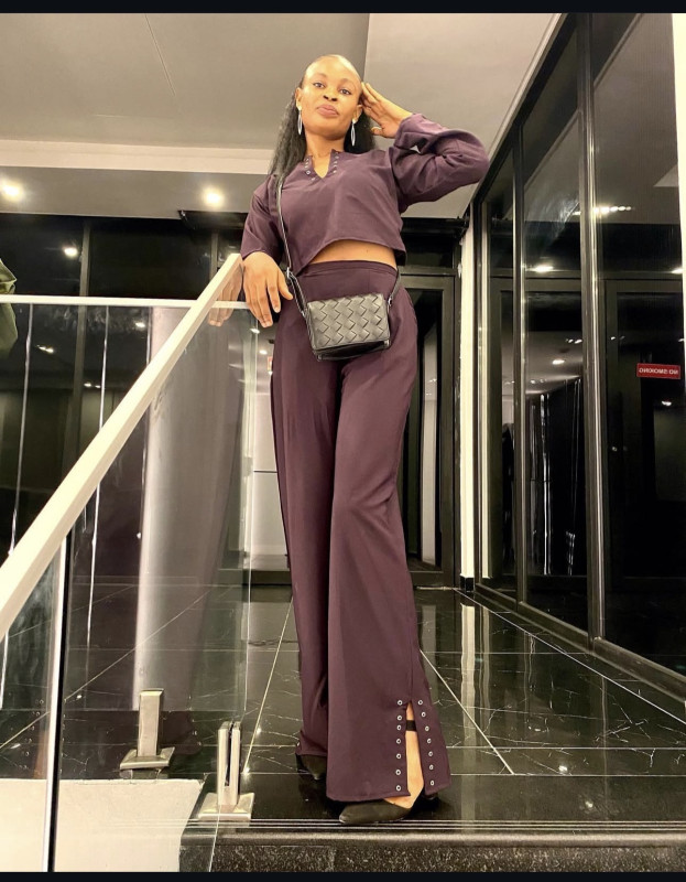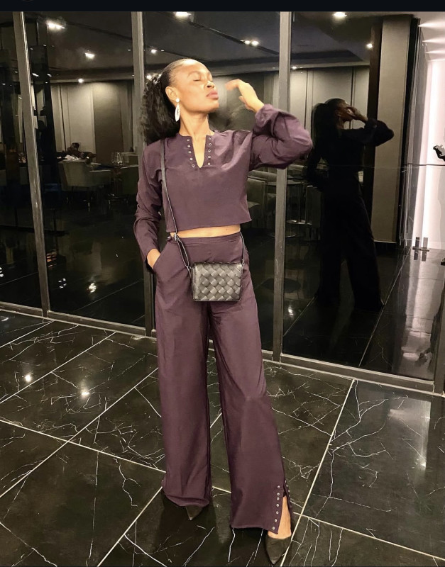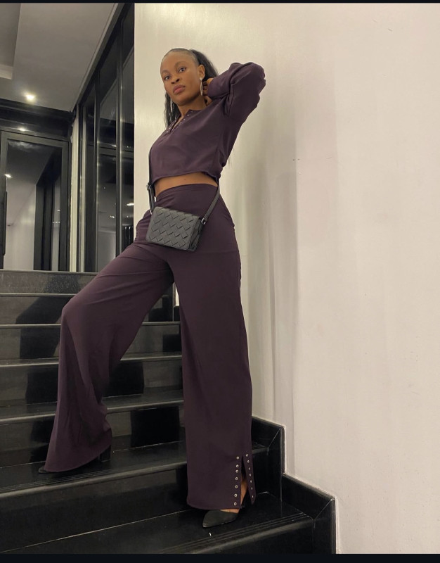 The V neckline of the top, accented with eyelet grommets, draws the eye with modern ingenuity, while the high-waist trousers flow gracefully, featuring side slits mirrored by matching grommet details. Together, the set balances strength and ease, with versatility for both statement moments and refined occasions.